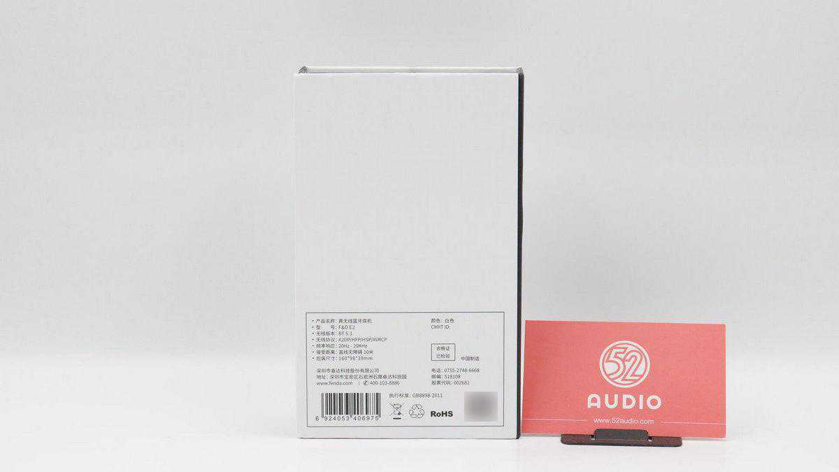 包装盒比较简约,画面中心区域是耳机的渲染图,左上角是奋达科技的品牌Logo,产品名“奋达E2真无线蓝牙耳机”。