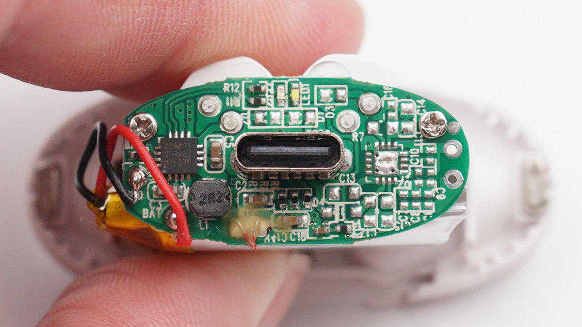 内部电路方面,充电盒通过USBType-C接口输入电源,思远SY8821集成度较高,支持输入过压保护,内部集成电池充放电模块,可配置指示灯,支持Hall控制,无需外部MCU,单芯片实现TWS充电仓应用设计;软包电池来自金宇宙,容量300mAh。