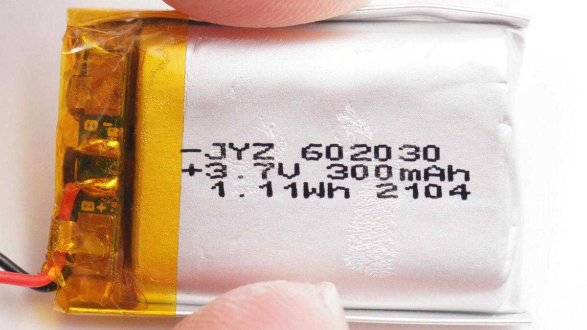 软包电池来自深圳市金宇宙能源有限公司,型号JYZ602030,额定电压3.7V,额定容量300mAh/1.11Wh。