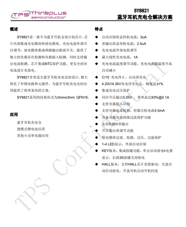 TPS思远SY8821蓝牙耳机充电仓解决方案,内部集成充电模块和放电模块。充电电流外部可以调节;放电模块集成两路输出限流开关,提供了独立的负载存在检测和负载插入检测,同时支持输出电流检测。芯片集成NTC保护功能,更安全的对电池进行充放电。