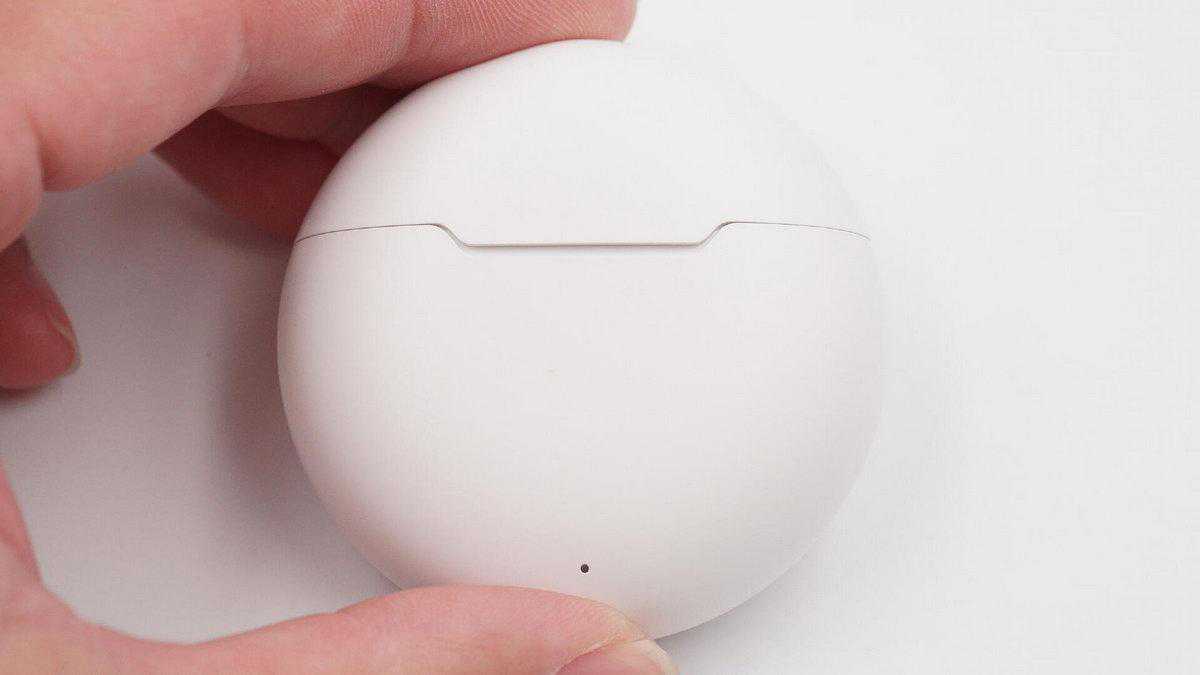 充电盒外观展示,鹅卵石造型,比较小巧;机身采用ABS+PC光滑材质,不易沾染指纹;盒盖开启处做了一个突出的设计,增加线条感;底部有一个状态指示灯。