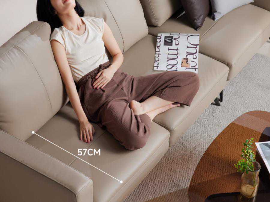 沙发坐深有57公分,正常坐上去以后腿部可以完全放在坐垫上,后背自然舒展靠在靠背上,完全不会有局促的感觉。拿掉靠背以后,座面深度有80公分,当做单人床午休小憩没啥问题。它的座包采用独立袋装弹簧+聚氨酯海绵+高回弹海绵三种材质复合填充而成,坐感柔软,但又具备很强的支撑性,不会有松垮塌陷或者太硬的感觉。