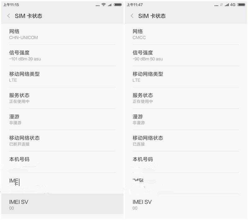 小米5在室内信号表现,左图为联通网络,右图为移动网络。联通的信号强度为-101dBm,39asu。移动的信号稍好,为-90dBm,50asu: