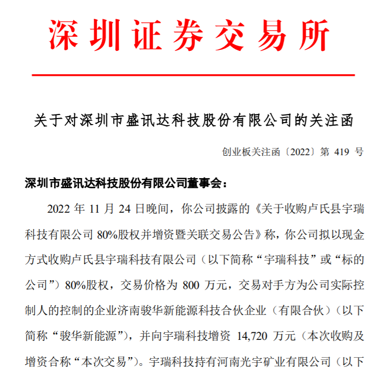 11月24日晚间,盛讯达发布公告称,盛讯达与骏华新能源、卢氏县宇瑞科技有限公司(以下简称“宇瑞科技”)及盛迅达实控人吴成华签署《股权收购协议》,拟以现金方式收购骏华新能源持有的宇瑞科技80%股权,交易价格800万元,对应注册资本2880万元;并与宇瑞科技少数股东山东瑞福锂业有限公司、宇瑞科技及吴成华签署《增资协议》,以1元/注册资本的增资价格,用14720万元现金认缴宇瑞科技新增的14720万元注册资本。