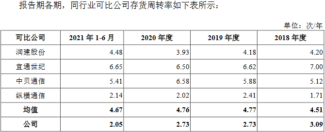 2018年、2019年、2020年和2021年1-6月,嘉环科技存货周转率分别为3.09次/年、2.73次/年、2.73次/年和2.05次/年,同行业可比公司存货周转率平均值分别为4.51次/年、4.77次/年、4.76次/年和4.67次/年。