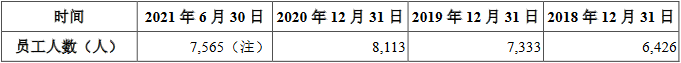 2018年末、2019年末、2020年末和2021年6月末,嘉环科技员工人数分别为6426人、7333人、8113人和7565人。
