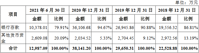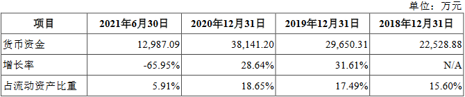 2018年末、2019年末、2020年末和2021年6月末,嘉环科技货币资金余额分别为2.25亿元、2.97亿元、3.81亿元和1.30亿元,占流动资产的比例分别为15.60%、17.49%、18.65%和5.91%。
