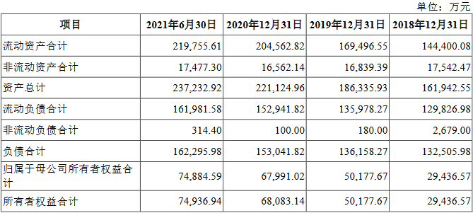 截至2018年12月31日、2019年12月31日、2020年12月31日和2021年6月30日,嘉环科技资产总额分别为16.19亿元、18.63亿元、22.11亿元和23.72亿元,负债总额分别为13.25亿元、13.62亿元、15.30亿元和16.23亿元。