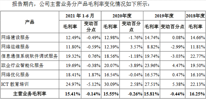 主营业务分产品来看,报告期内,嘉环科技网络建设服务是公司毛利额最大的业务,网络建设服务毛利率分别为14.66%、14.74%、12.98%和12.49%;网络运维服务毛利率分别为11.81%、8.82%、12.39%和11.80%;信息通信系统软件调试服务毛利率分别为22.77%、19.74%、18.56%和19.32%;政企行业智能化服务毛利率分别为19.50%、23.96%、20.07%和19.69%;网络优化服务毛利率分别为16.10%、16.57%、16.54%和18.41%;ICT教育培训占毛利总额的5%以内,影响较小,该业务毛利率分别为22.13%、27.51%、30.09%和24.97%。