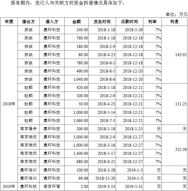2018年,因业务发展需要,嘉环科技向宗琰、赵颖、南京瑞欣分别拆入3570万元、2630万元和6080万元以补充流动资金。相关借款在参照银行同期贷款利率基础上按照年利率7%作为借款利率,2018年公司分别向宗琰、赵颖、南京瑞欣支付了资金占用费143.01万元、111.25万元和332.39万元。南京隆宇和嘉环培训的借款金额较低,借款时间较短,未支付利息。