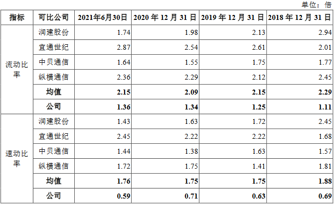 截至报告期各期末,同行业可比公司合并口径下资产负债率分别为40.02%、40.63%、48.71%和47.55%,同行业可比公司流动比率平均值分别为2.29倍、2.15倍、2.09倍和2.15倍,同行业可比公司速动比率平均值分别为1.88倍、1.75倍、1.75倍和1.76倍。