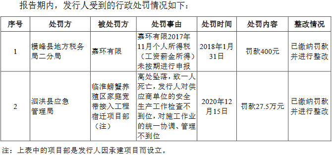 2018年1月31日,嘉环有限由于2017年11月个人所得税(工资薪金所得)未按期进行申报,被横峰县地方税务局二分局罚款400元。根据招股说明书,该公司表示已缴纳罚款并进行整改。