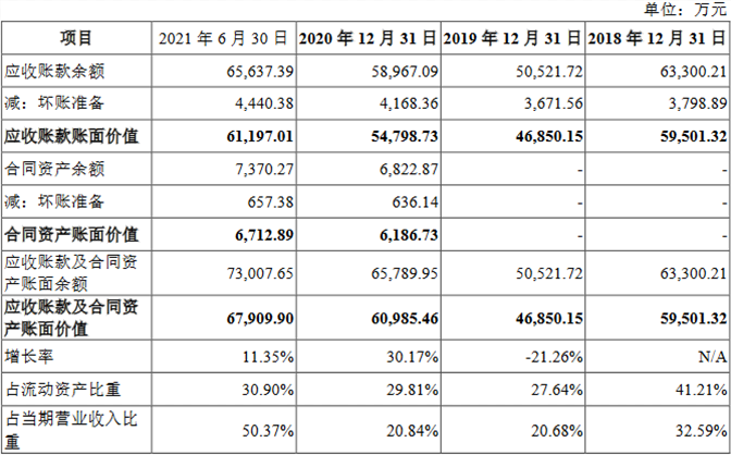 2018年末、2019年末、2020年末和2021年6月末,嘉环科技应收账款及合同资产账面价值合计分别为5.95亿元、4.69亿元、6.10亿元和6.79亿元,占流动资产的比例分别为41.21%、27.64%、29.81%和30.90%,占当期营业收入的比例分别为32.59%、20.68%、20.84%和50.37%。