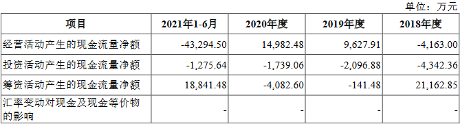 2021年1-6月经营活动产生的现金流量净额为-4.33亿元
