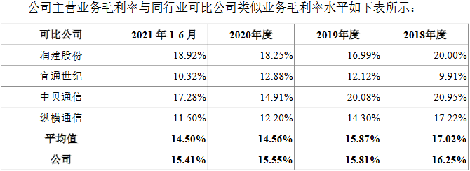 2018年、2019年、2020年和2021年1-6月,嘉环科技的综合毛利率分别为16.31%、16.09%、15.78%和15.74%,其中,主营业务毛利率分别为16.25%、15.81%、15.55%和15.41%;同行业可比公司毛利率平均值分别为17.02%、15.87%、14.56%和14.50%。