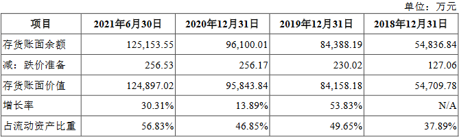 2018年末、2019年末、2020年末和2021年6月末,嘉环科技存货账面价值分别为5.47亿元、8.42亿元、9.58亿元和12.49亿元,存货金额较大,占总资产的比例分别为33.78%、45.16%、43.34%和52.65%。