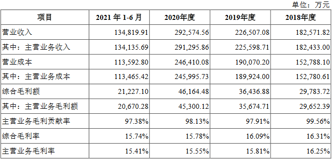 2018年、2019年、2020年和2021年1-6月,嘉环科技的综合毛利率分别为16.31%、16.09%、15.78%和15.74%,其中,主营业务毛利率分别为16.25%、15.81%、15.55%和15.41%。