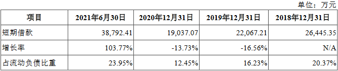 2018年末、2019年末、2020年末和2021年6月末,嘉环科技短期借款余额分别为2.64亿元、2.21亿元、1.90亿元和3.88亿元,占流动负债的比例分别为20.37%、16.23%、12.45%和23.95%。
