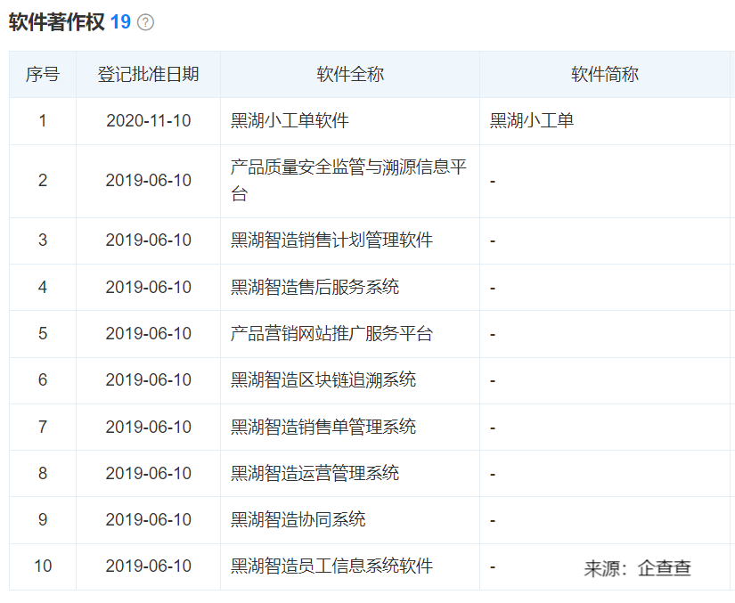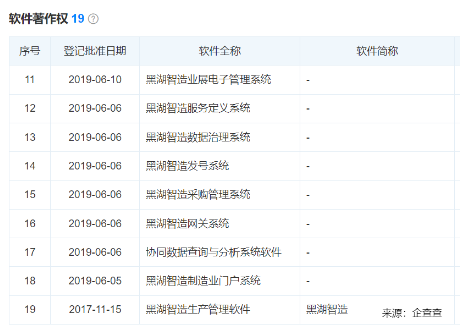 7.产品范围上面一直提到黑湖科技是一个工业协同平台,所以它的产品范围就不会被MES所局限,从下面两张近几年来黑湖科技分享的软件著作权可以看出,黑湖科技涉及的范围有“销售、生产、采购、供应链、人员、数据治理、区块链追溯、质量和售后”等。但是一些底层的数采(SCADA)方面,还是采取与其他供应商合作的方式部署。