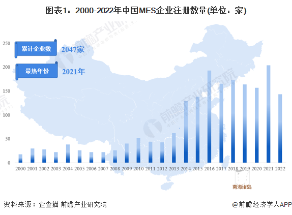 根据中国企业数据库企查猫,目前中国MES行业的主要企业共有2047家,其中以2021年为主要注册热潮,2021年注册企业数量为204家,新注册企业数量仍处于高位。