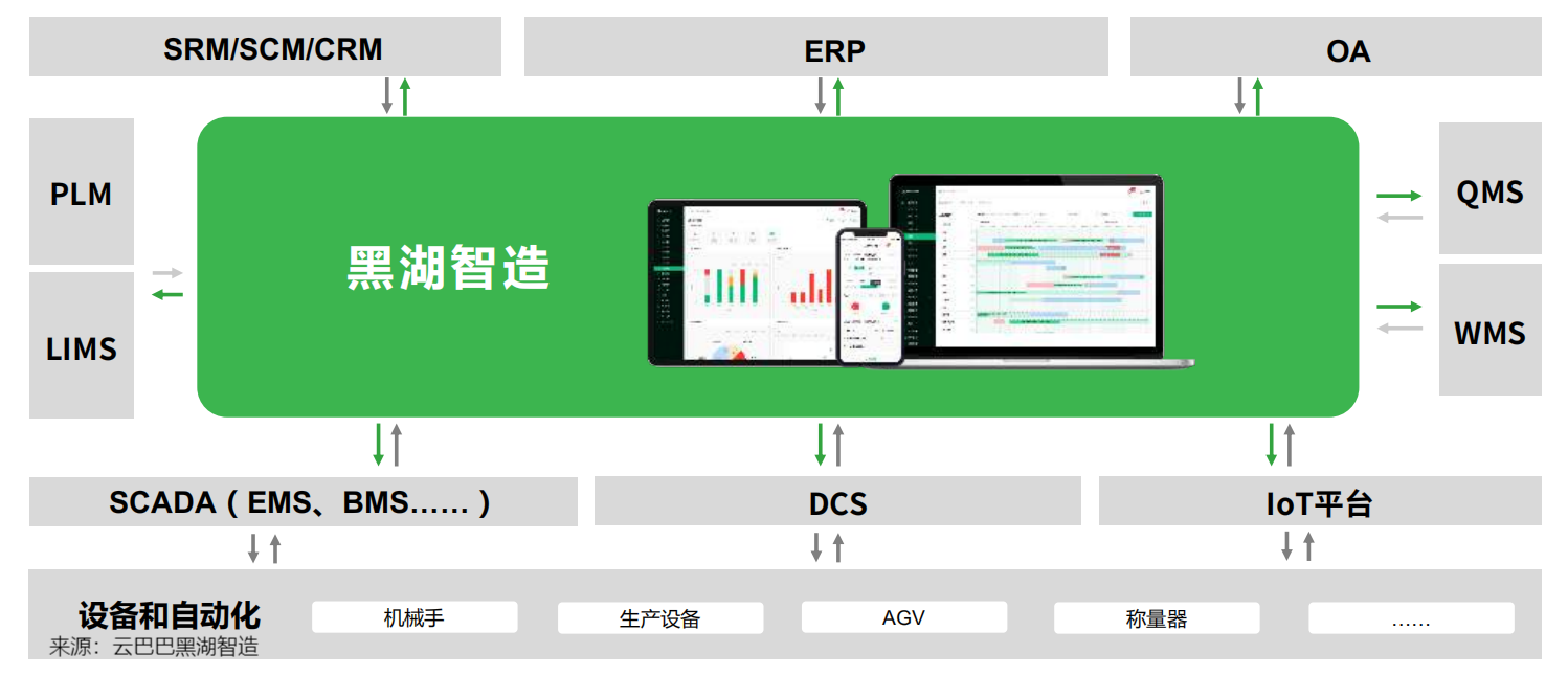1.工厂数字化蓝图「黑湖智造」作为工业制造协同平台,与其他数字化管理的系统都有着紧密的配合,从销售端、供应链、资源计划层、流程管理、产品、质量、仓库、实验室等方面,还有底层设备的数采、控制、物联系统等,都有协同关系,如图: