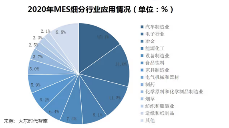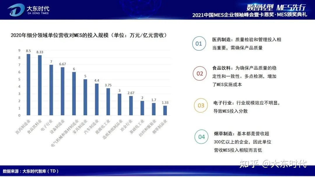 从MES细分领域单位营收对MES的投入规模分析,医药制造、食品饮料、电子行业投入比最高,如图: