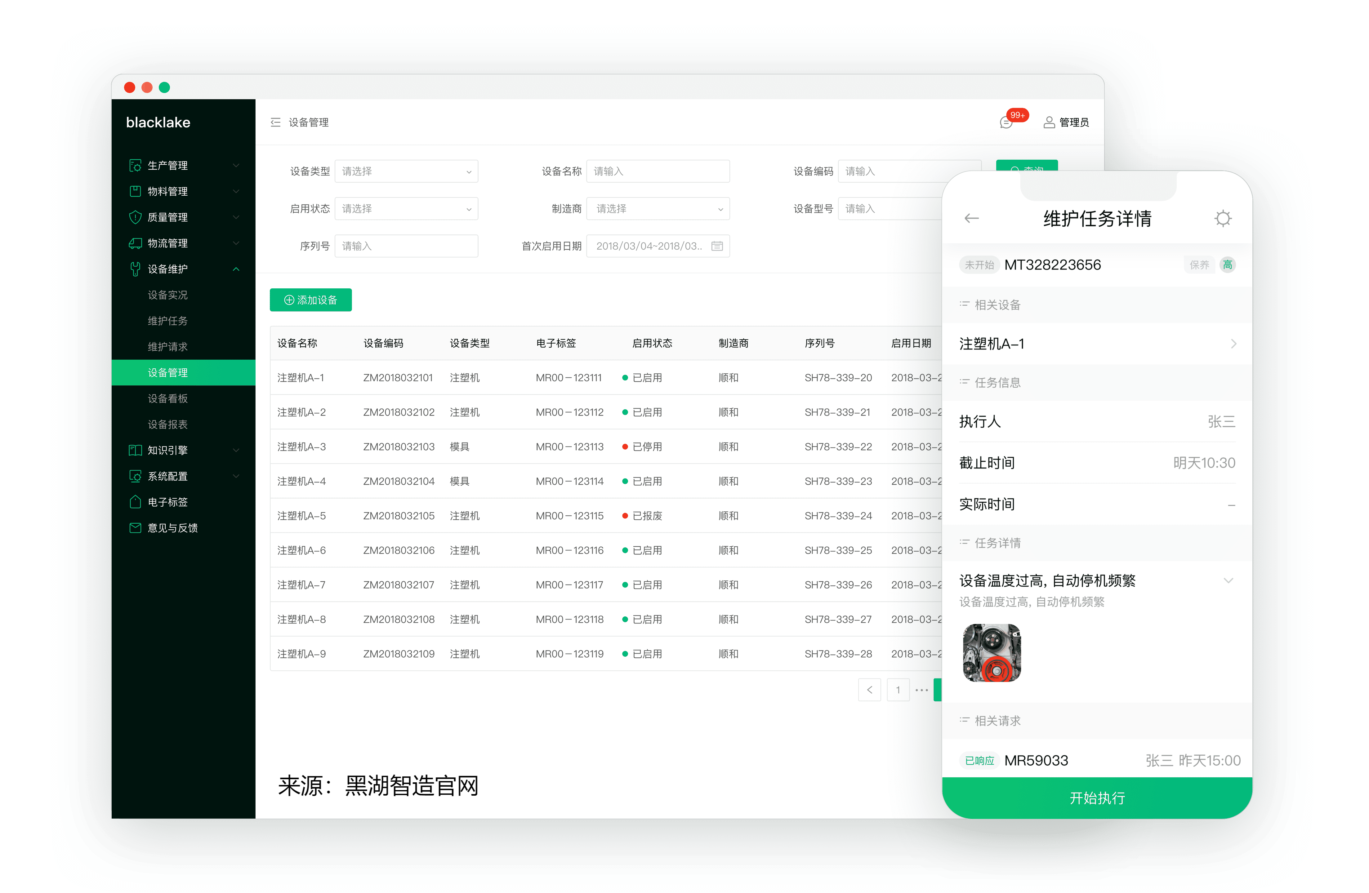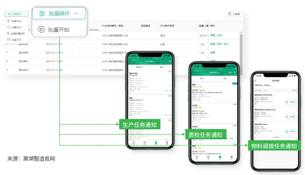 「黑湖智造」是面向中大型企业的,是一款基于云端的智能制造协同系统,支持移动端及Web端多平台登录,采用SAAS模式为客户提供服务。主要为制造业提供计划排产、生产执行、质量管理、仓储管理、资源管理和可视化数据分析等协同管理功能。