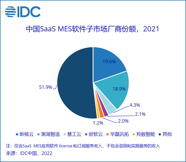 从竞争格局来看,西门子、SAP、宝信软件在2021年中国制造执行系统(MES)软件市场排名前三。鼎捷软件、罗克韦尔、黑湖智造、新核云、中控技术等分列第四到第八。而在中国SAASMES软件子市场份额中,新核云与黑湖智造分别以19.6%和18.9%占据市场前二。