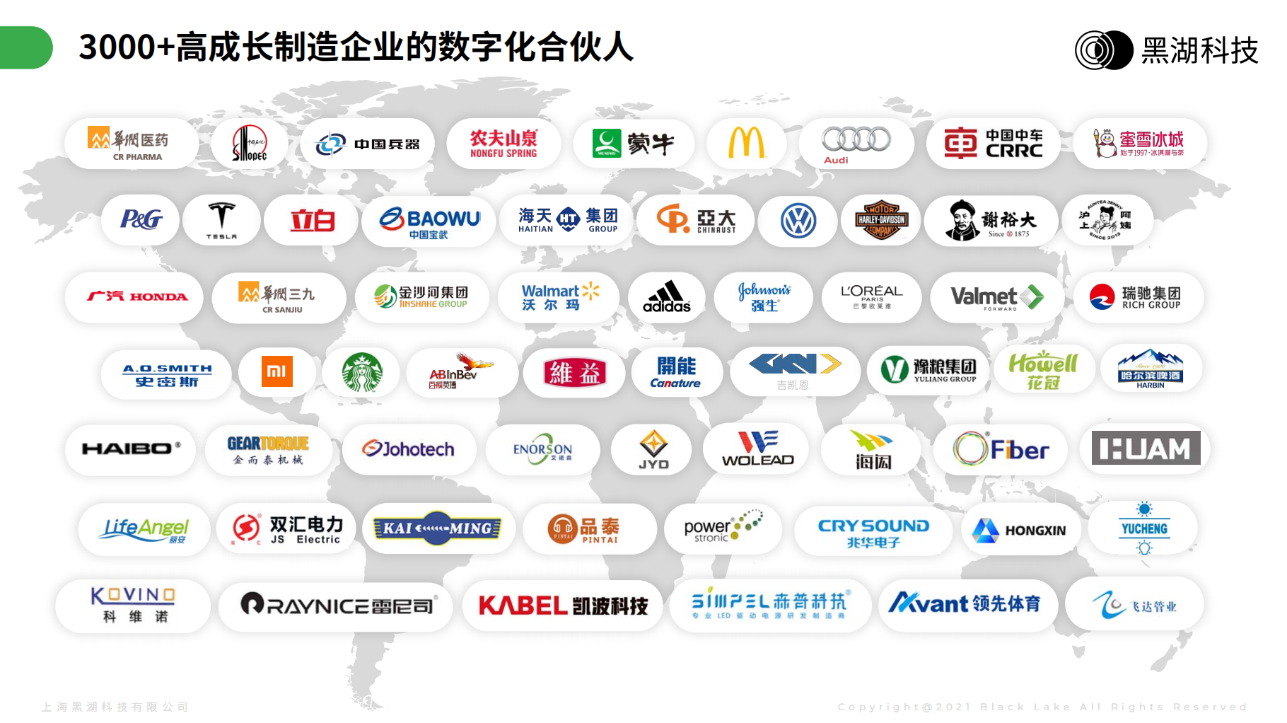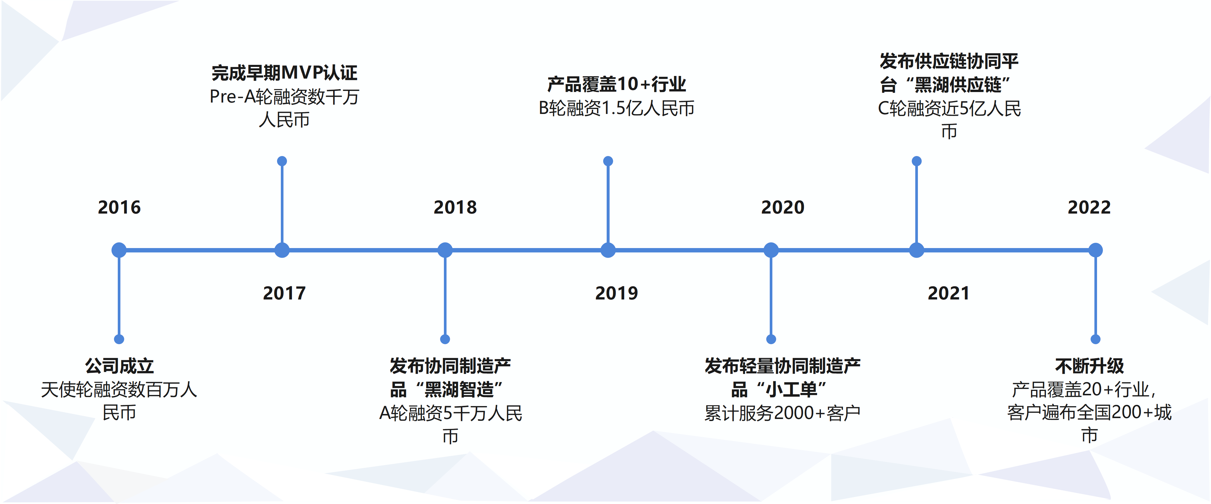 三、拆解黑湖科技1.黑湖科技简介黑湖科技网络科技有限公司成立于2016年,致力于工厂数字化转型产品研发,先后推出「黑湖智造」、「黑湖小工单」、「黑湖供应链」等SAAS应用,构筑起入口级工业协同平台,打破制造企业内外部数据孤岛,实现生产现场信息的实时聚合、协作、分析与决策。