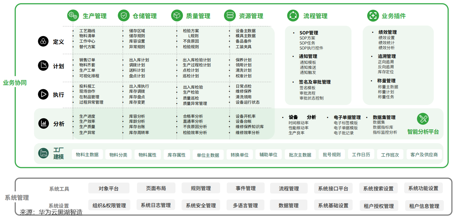 作为通用型的SaaS产品,其PaaS能力也要有足够的支持。从工厂建模的基础设置开始,到基础数据定义和录入,再到计划的录入、执行和分析,辅以流程管理、业务插件和智能分析平台,基于这样的矩阵微服务(500+),灵活的适配不同的业务。