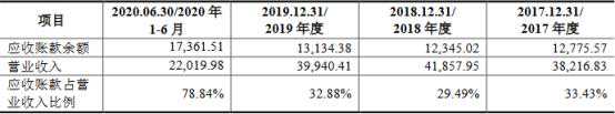 过去五年及一期,密封科技应收账款的账面价值分别为5467.35万元、5901.14万元、1.21亿元、1.17亿元、1.24亿元和1.65亿元,占各期末流动资产的比例分别为34.57%、27.94%、37.00%、34.41%、28.98%和36.61%;应收账款余额分别为5783.59万元、6253.60万元、1.28亿元、1.23亿元、1.31亿元和1.74亿元,占营业收入的比例分别为25.71%、23.69%、33.43%、29.49%、32.88%和78.84%。