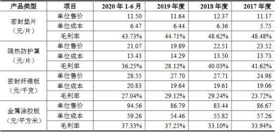 其中,密封垫片单位售价分别为8.62元/片、9.91元/片、11.17元/片、12.37元/片、11.64元/片和11.50元/片,毛利率分别为42.43%、50.33%、48.48%、48.62%、44.71%和43.73%;隔热防护罩单位售价分别为23.52元/片、22.51元/片、19.89元/片和21.07元/片,毛利率分别为33.47%、34.52%、41.62%、40.03%、28.12%和36.25%;密封纤维板单位售价分别为22.33元/千克、22.75元/千克、18.82元/千克、21.35元/千克、24.98元/千克、27.71元/千克、27.70元/千克和28.55元/千克,毛利率分别为17.97%、16.12%、23.72%、29.24%、29.12%和27.04%;金属涂胶板单位售价分别为78.87元/平方米、88.66元/平方米、86.67元/平方米、83.44元/平方米、86.79元/平方米和94.56元/平方米,毛利率分别为23.64%、31.66%、33.94%、33.10%、37.25%和37.33%。