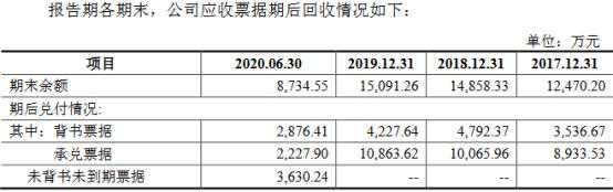 截至2017年12月31日、2018年12月31日、2019年12月31日和2020年6月30日,密封科技背书票据金额分别为3536.67万元、4792.37万元、4227.64万元和2876.41万元,承兑票据金额分别为8933.53万元、1.01亿元、1.09亿元和2227.90万元,未背书未到期票据分别为0元、0元、0元和3630.24万元。