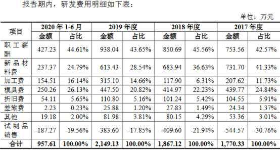过去五年及一期,密封科技研发费用主要系预研发及同步研发相关费用,主要费用系研发项目有关人员的薪酬、消耗的新材料及模具费。过去五年及一期,该公司研发费用中,职工薪酬分别为651.42万元、611.70万元、753.56万元、850.69万元、938.04万元和427.23万元,占比分别为41.34%、24.04%、42.57%、45.56%、43.65%和44.61%;新品材料费分别为177.85万元、573.10万元、731.70万元、683.94万元、613.43万元和237.37万元,占比分别为11.29%、22.52%、41.33%、36.63%、28.54%和24.79%;模具费分别为393.04万元、994.87万元、439.77万元、414.97万元、447.50万元和250.26万元,占比分别为24.94%、39.09%、24.84%、22.23%、20.82%和26.13%。