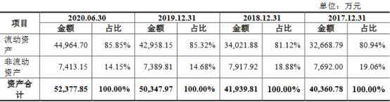截至2015年12月末、2016年12月末、2017年12月末、2018年12月末、2019年12月末和2020年6月末,密封科技资产总额分别为2.42亿元、2.93亿元、4.04亿元、4.19亿元、5.03亿元和5.24亿元。其中,该公司流动资产分别为1.58亿元、2.11亿元、3.27亿元、3.40亿元、4.30亿元和4.50亿元,占总资产的比例分别65.23%、72.13%、80.94%、81.12%、85.32%和85.85%;非流动资产分别为8430.16万元、8159.45万元、7692.00万元、7917.92万元、7389.81万元和7413.15万元,占总资产的比例分别为34.77%、27.87%、19.06%、18.88%、14.68%和14.15%。