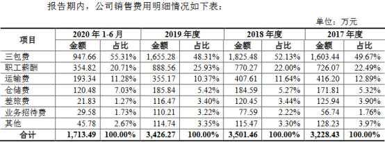 过去五年及一期,该公司销售费用主要为三包费、职工薪酬以及运输费等项目。其中,三包费分别为828.78万元、1032.23万元、1603.44万元、1825.48万元、1655.28万元和947.66万元,占销售费用的比例分别为37.65%、39.35%、49.67%、52.13%、48.31%和55.31%;职工薪酬分别为612.50万元、687.09万元、726.07万元、770.27万元、888.56万元和354.82万元,占销售费用的比例分别为27.83%、26.19%、22.49%、22.00%、25.93%和20.71%;运输费分别为378.80万元、450.70万元、416.20万元、407.61万元、355.17万元和193.34万元,占比分别为17.21%、17.18%、12.89%、11.64%、10.37%和11.28%。