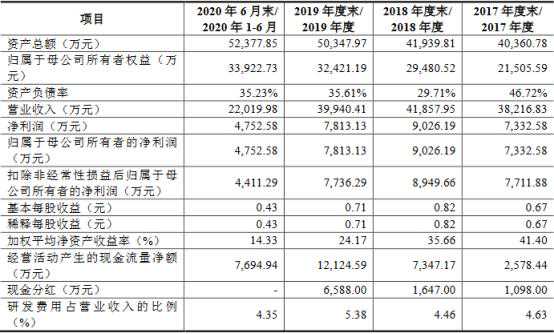 2015年、2016年、2017年、2018年、2019年和2020年上半年,密封科技实现营业收入分别为2.25亿元、2.64亿元、3.82亿元、4.19亿元、3.99亿元和2.20亿元;实现净利润分别为-644.21万元、3404.64万元、7332.58万元、9026.19万元、7813.13万元和4752.58万元;实现扣除非经常性损益后归属于母公司所有者的净利润分别为1376.22万元、3390.17万元、7711.88万元、8949.66万元、7736.29万元和4411.29万元。