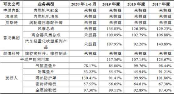 2017年、2018年、2019年和2020年上半年,密封科技气缸盖垫片产能利用率分别为98.44%、99.76%、85.00%和78.17%;附属垫片产能利用率为91.21%、45.94%、55.57%和53.22%;密封纤维板产能利用率分别为67.38%、64.61%、56.65%和49.01%;隔热防护罩产能利用率分别为101.86%、99.99%、91.41%和130.41%;金属涂胶板产能利用率分别为87.43%、92.89%、99.11%和97.30%。