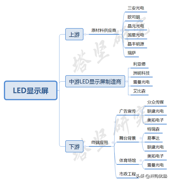 下游——以ToG为主分为不同终端应用领域,如广告宣传、舞台背景、体育场馆、市政工程,代表企业有分众传媒、特瑞森等。