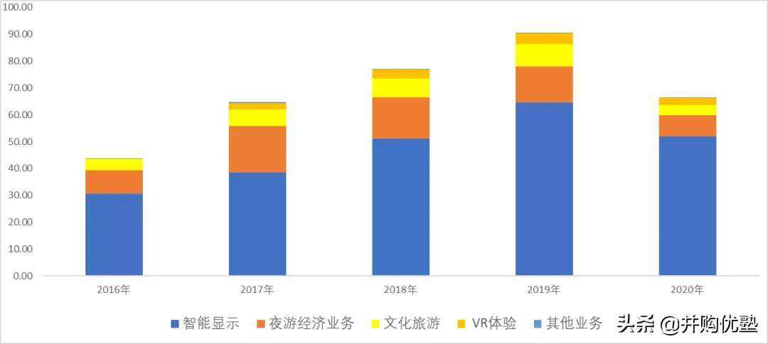 2020年,受卫生事件影响其营业收入整体下滑26.68%,其中文化旅游业务下滑56%、夜游经济业务下滑40%、VR体验下滑33%、智能显示下滑19.52%。
