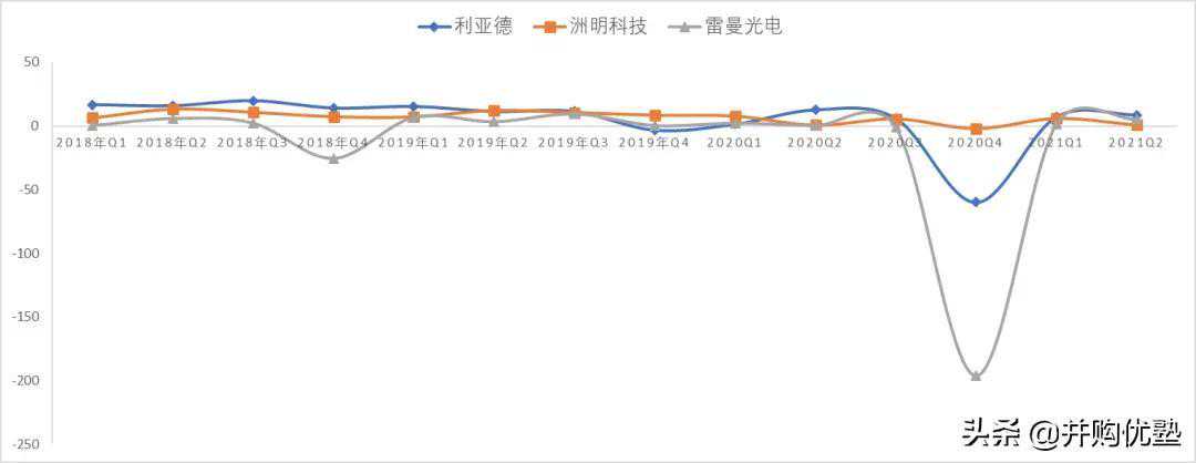 2018年Q4、2020年Q4,雷曼光电净利率分别为-25.5%、-195.82%,造成净利率为负的主要原因是商誉计提减值1.37亿元,导致净利润亏损。原因是其收购的全资子公司拓亨科技海外收入占比超过90%,20218年、2020年受大环境以及卫生事件影响,导致其经营状况未达预期。