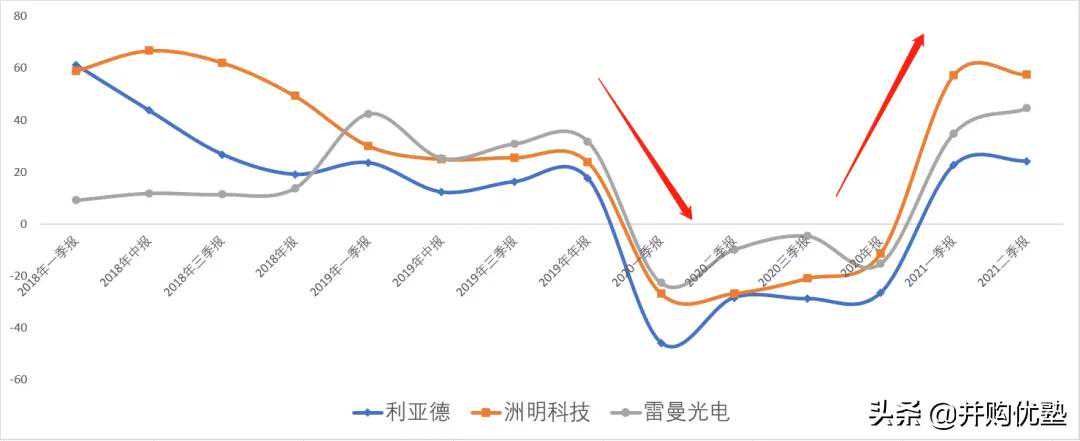 2019年雷曼光电净利润高增长,主要是上一年商誉减值占比较高;利亚德净利润增速下滑44.33%,主要原因有,一是夜游经济竞争加剧,毛利率下降17.82%;二是管理层及员工加薪,管理费用同比增加15.95%;三是财务费用同比增长63.79%。