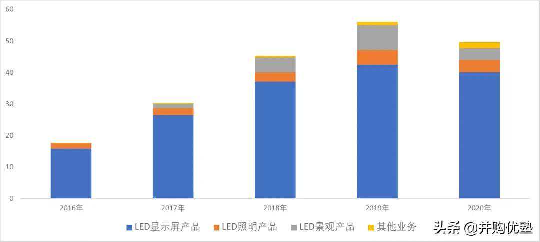 2020年,同样受卫生事件影响,其营业收入整体下滑11.46%。其中,LED景观照明同比下滑53.7%、LED通用照明下滑12.46%、LED显示屏下滑5.96%。