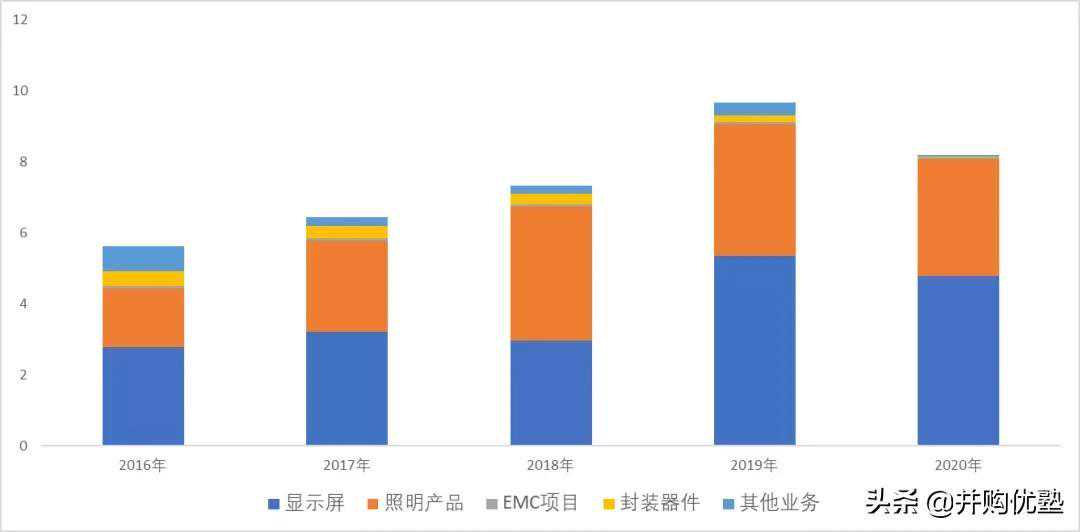 2016年至2020年,其LED照明产品年复合增速18.74%,高于显示屏的14.49%。2020年,显示屏营业收入同比下滑10.74%,照明产品下滑10.93%。
