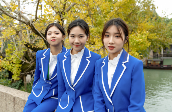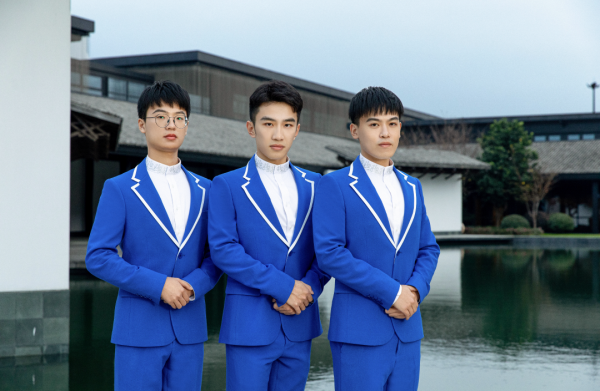 男女志愿者则身着蓝白配的时尚学院风套装,简洁的中式领设计,领口、袖口均有蕾丝银丝刺绣,体现青年志愿者的朝气与活力。