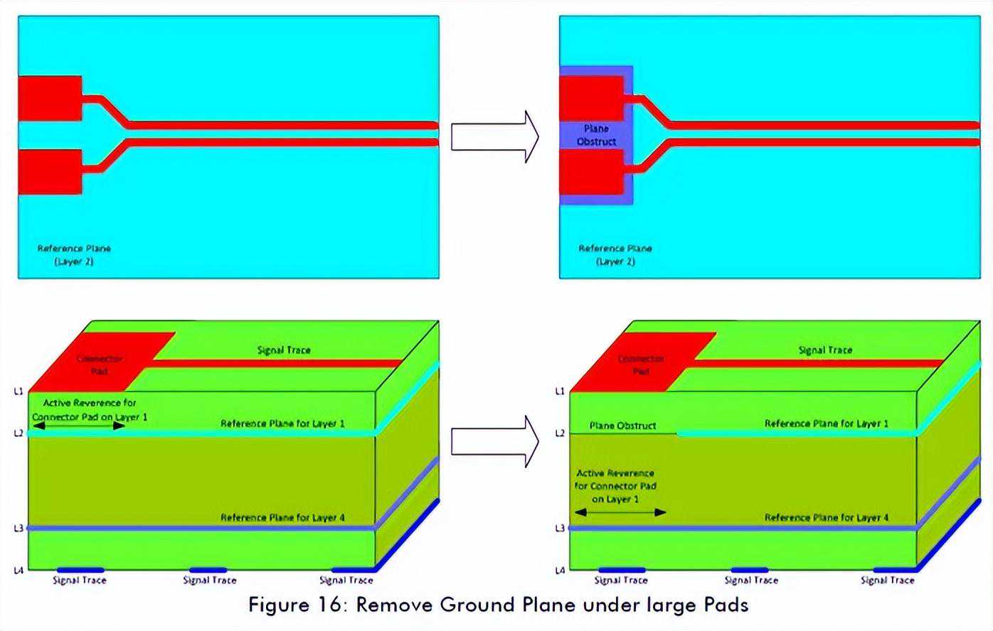 过孔是另外一种会产生阻抗不连续的源头。为了最小化这种效应,在内层和过孔连接的不需要的铜皮应该去除。而这样的操作其实可以在设计的时候通过CAD工具来消除或者联系沟通PCB加工产假来消除不需要的铜皮,保证阻抗的连续性。