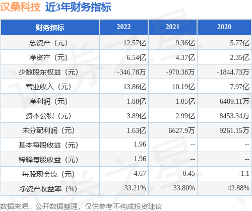 从目前公布的财报来看,汉桑科技2022年总资产为12.57亿元,净资产为6.54亿元;近3年净利润分别为1.88亿元(2022年),1.05亿元(2021年),6409.11万元(2020年)。详情见下表:
