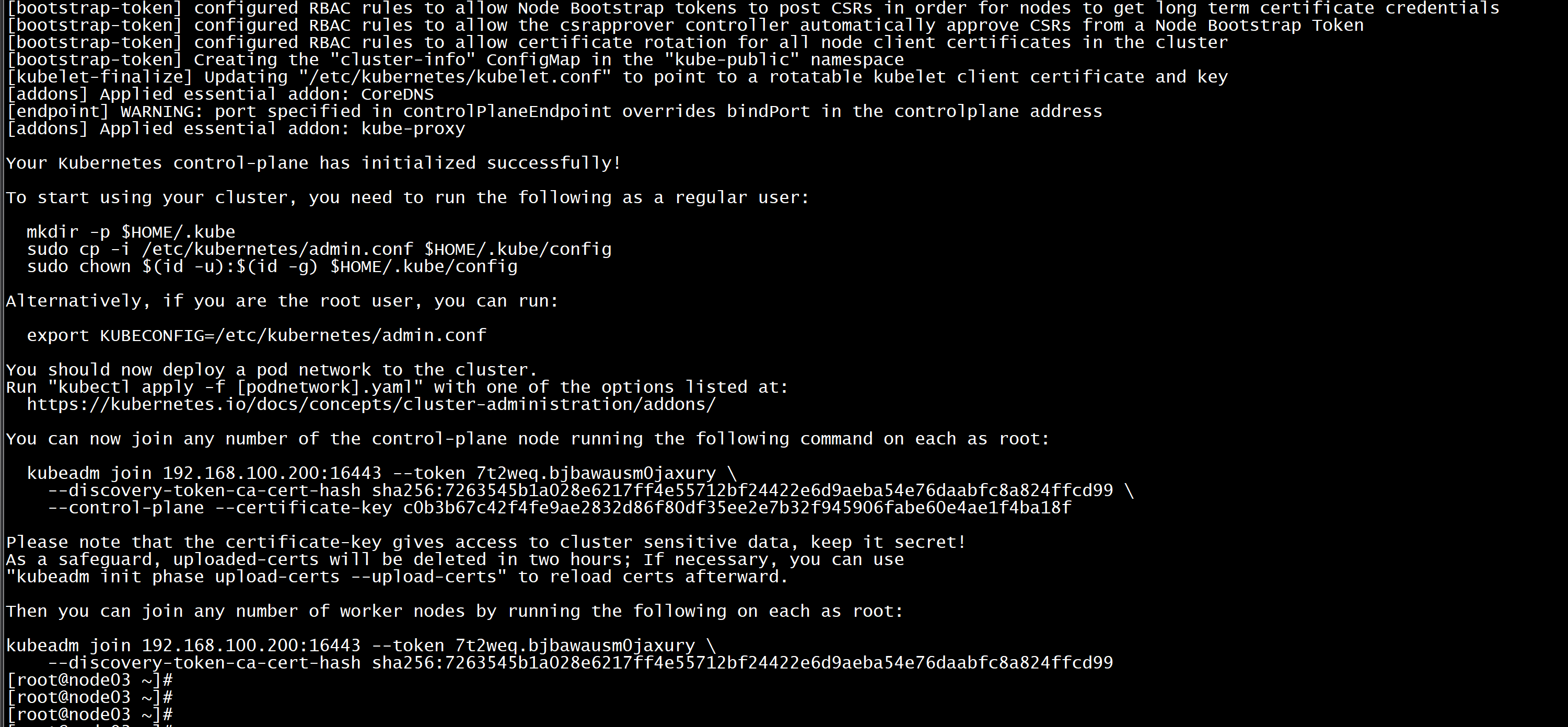 YourKubernetescontrol-planehasinitializedsuccessfully!Tostartusingyourcluster,youneedtorunthefollowingasaregularuser:mkdir-p$HOME/.kubesudocp-i/etc/kubernetes/$HOME/.kube/configsudochown$(id-u):$(id-g)$HOME/.kube/configAlternatively,ifyouaretherootuser,youcanrun:exportKUBECONFIG=/etc/kubernetes/"kubectlapply-f[podnetwork].yaml"withoneoftheoptionslistedat:\--discovery-token-ca-cert-hashsha256:7263545b1a028e6217ff4e55712bf24422e6d9aeba54e76daabfc8a824ffcd99\--control-plane--certificate-keyc0b3b67c42f4fe9ae2832d86f80df35ee2e7b32f945906fabe60e4ae1f4ba18fPleasenotethatthecertificate-keygivesaccesstoclustersensitivedata,keepitsecret!Asasafeguard,uploaded-certswillbedeletedintwohours;Ifnecessary,youcanuse"kubeadminitphaseupload-certs--upload-certs"asroot::16443--\--discovery-token-ca-cert-hashsha256:7263545b1a028e6217ff4e55712bf24422e6d9aeba54e76daabfc8a824ffcd99