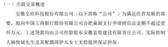 挖贝网4月8日,交欣科技(873680)近日发布公告,安徽交欣科技股份有限公司(以下简称“公司”)为满足经营发展的需要,拟向中国工商银行股份有限公司合肥巢湖支行申请授信总金额不超过壹仟万元,上述贷款均由公司控股股东安徽富煌建设有限责任公司、实际控制人杨俊斌及其配偶周伊凡无偿提供保证担保。