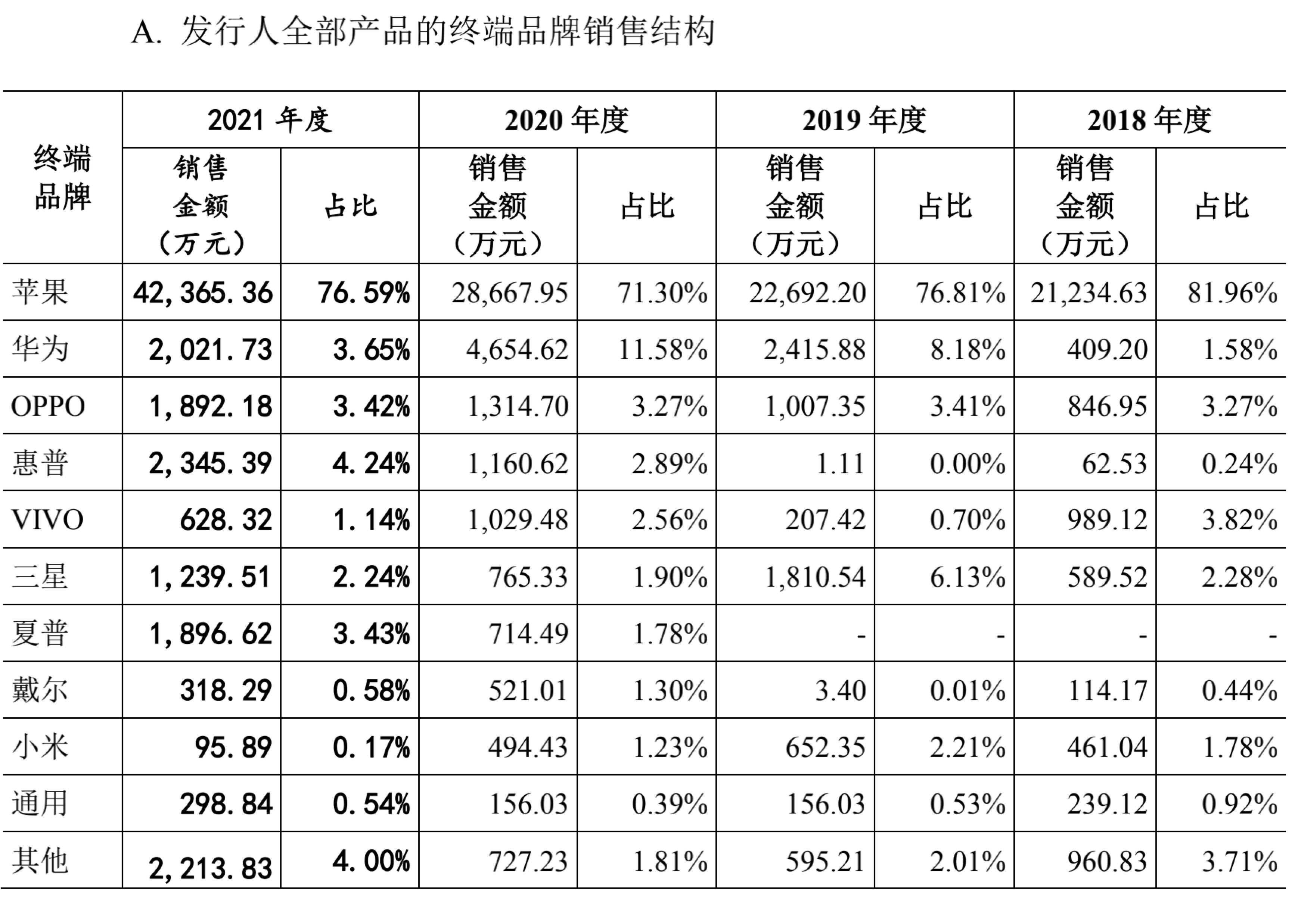 在对“同行业毛利率对比分析”当中,六淳科技表示,“针对同行业的终端品牌销售结构数据而言,主要有近期上市的鸿富瀚、达瑞电子、博硕科技可供参考”。而在这里六淳科技也披露了对苹果相关产品销售,相关销售收入占其2021年营业收入的76.59%。